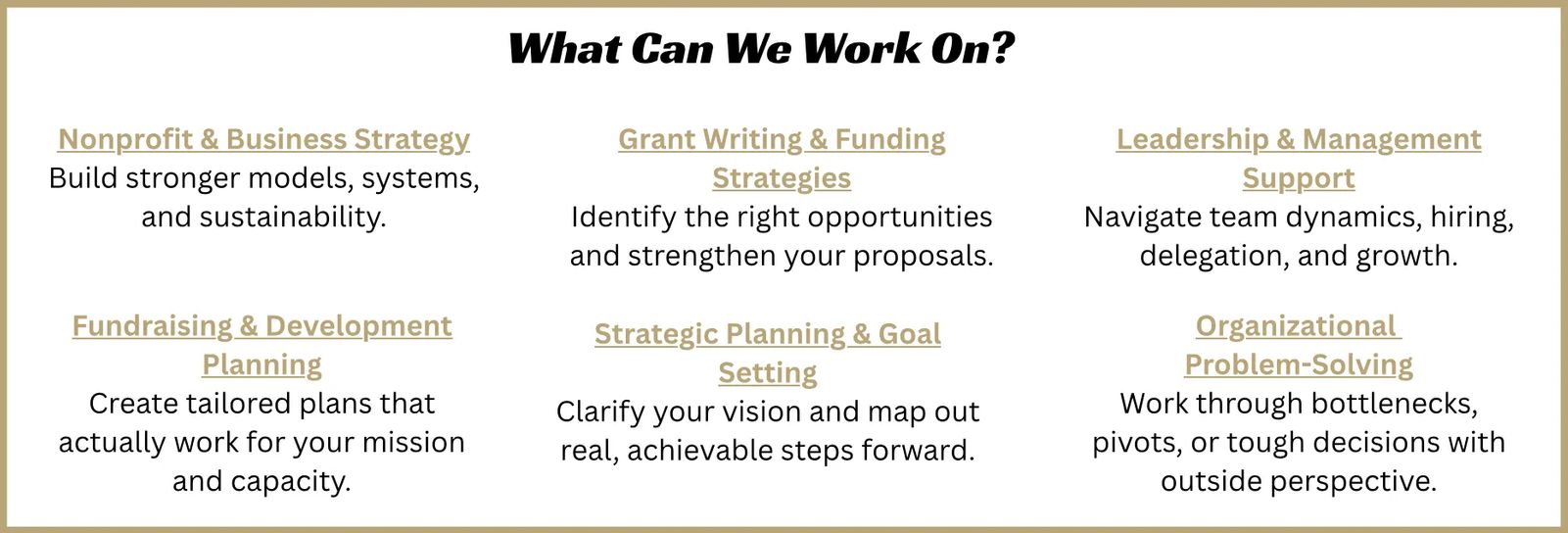 Not sure what you need? No problem. We'll figure it out together. We can focus on what matters most to you — from nonprofit or business strategy to fundraising and development planning. Whether it’s grant writing, strategic goal setting, leadership challenges, or overcoming organizational hurdles, your session will be tailored to where you are and where you want to go.